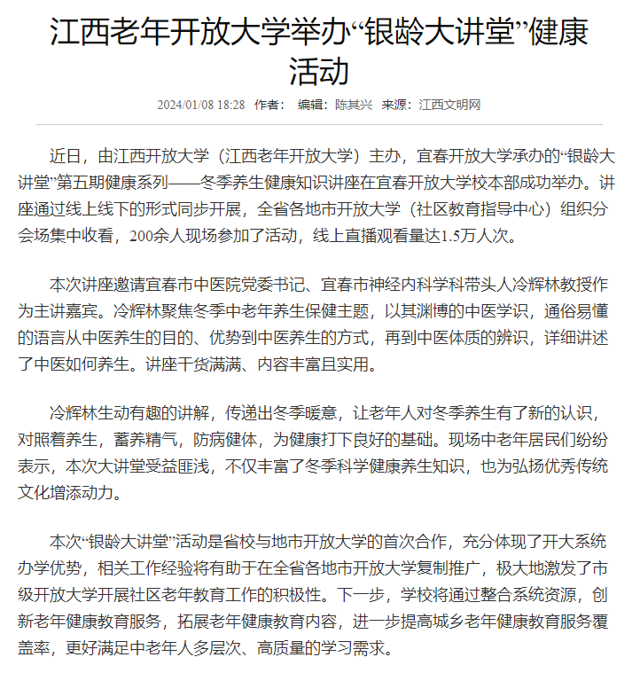 近日,由437必赢会员中心(江西老年开放大学)主办,宜春开放大学承办的“银龄大讲堂”第五期健康系列——冬季养生健康知识讲座在宜春开放大学校本部成功举办。讲座通过线上线下的形式同步开展,全省各地市开放大学(社区教育指导中心)组织分会场集中收看,200余人现场参加了活动,线上直播观看量达1.5万人次。