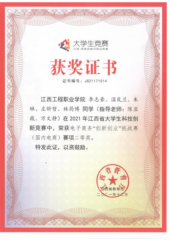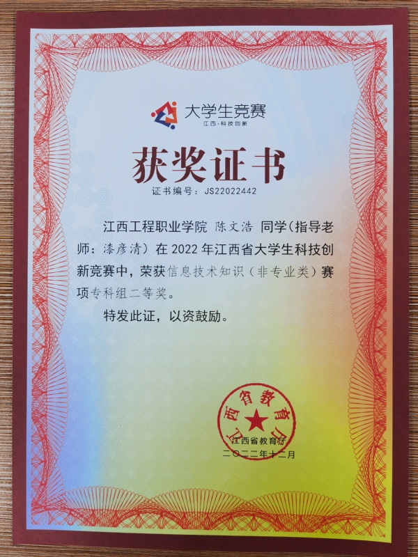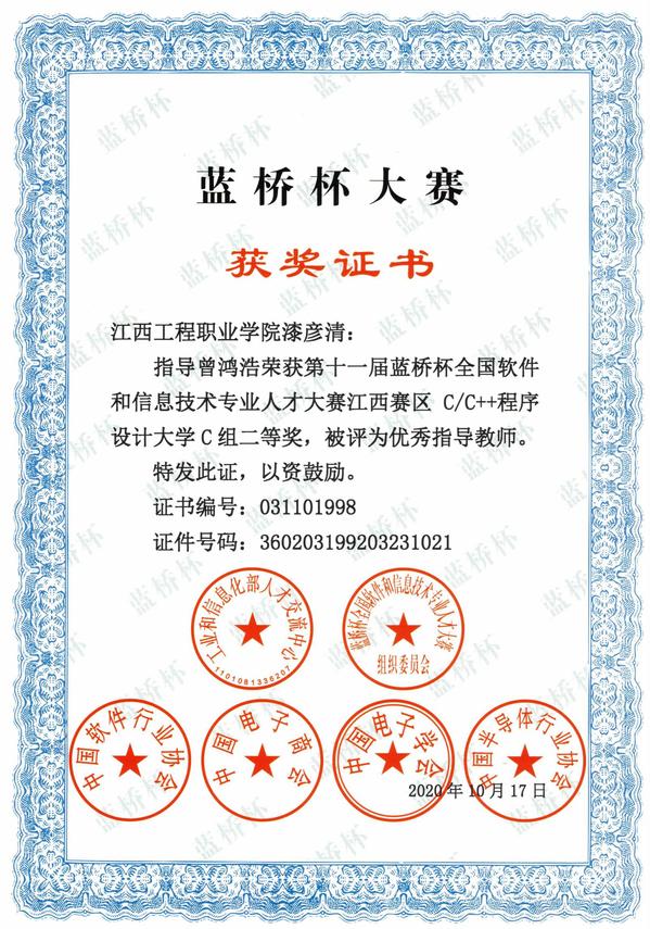 漆彦清始终坚持“以赛促学、以赛促教、学赛结合”教学模式,通过参加技能竞赛,不断改进和优化教学设计,提升个人技能水平的同时,带领学生共同进步。指导学生参加江西省大学生信息技术知识大赛(专科组)获2019年三等奖、2020年三等奖、2022年二等奖;指导学生参加江西省大学生信息安全技术大赛(专科组)获2019年三等奖、2020年一等奖、2022年二等奖;被评为第十一届蓝桥杯全国软件和信息技术专业人才大赛“优秀指导教师”。