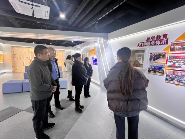 在上海市老年教育成果展示厅,调研组详细了解了“资源学习、场馆体验、应用实践”闭环式的智慧学习应用场景模式和“场所资源”“数据资源”“学习资源”“智慧校园”四个板块内容,了解了上海市老年教育的发展概况。