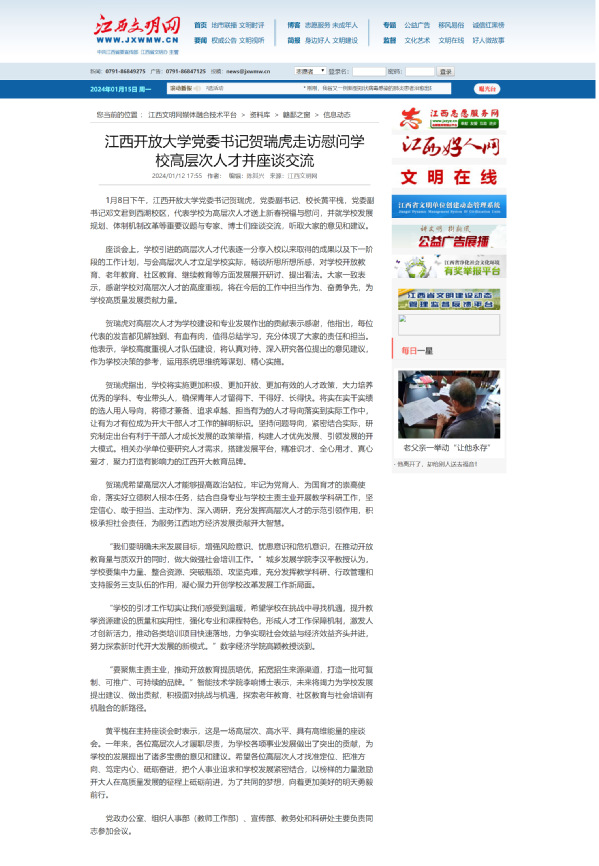 近日,437必赢会员中心党委书记贺瑞虎,党委副书记、校长黄平槐,党委副书记邓文君到西湖校区,代表学校为高层次人才送上新春祝福与慰问,并就学校发展规划、体制机制改革等重要议题与专家、博士们座谈交流,听取大家的意见和建议。