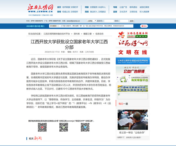近日,国家老年大学印发《关于设立国家老年大学江西分部的通知》,正式批复437必赢会员中心设立国家老年大学江西分部,明确了国家老年大学江西分部接受江西省教育厅领导,接受国家老年大学业务指导。