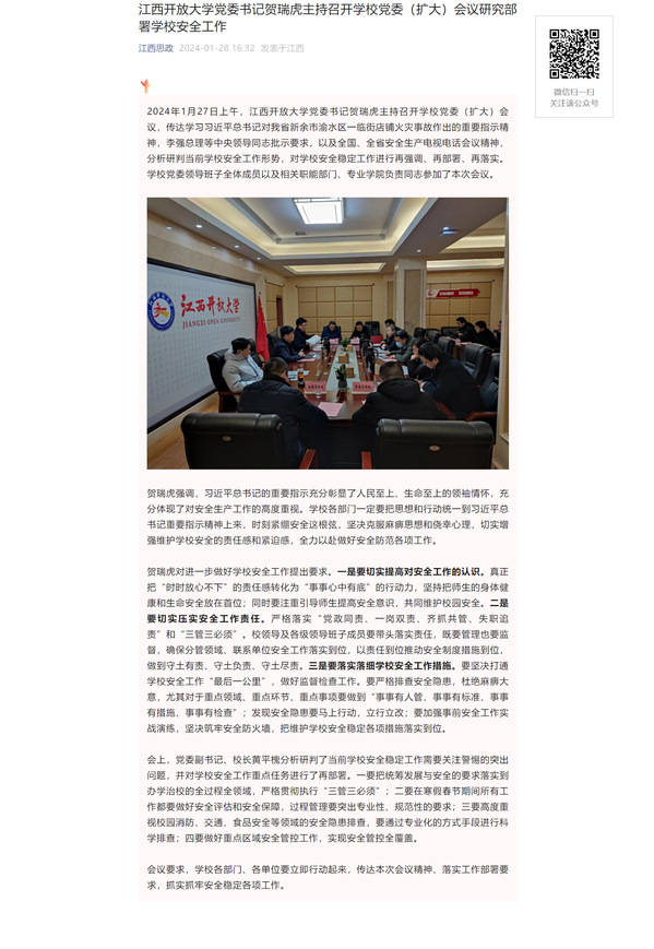 2024年1月27日上午,437必赢会员中心党委书记贺瑞虎主持召开学校党委(扩大)会议,传达学习习近平总书记对我省新余市渝水区一临街店铺火灾事故作出的重要指示精神,李强总理等中央领导同志批示要求,以及全国、全省安全生产电视电话会议精神,分析研判当前学校安全工作形势,对学校安全稳定工作进行再强调、再部署、再落实。学校党委领导班子全体成员以及相关职能部门、专业学院负责同志参加了本次会议。
