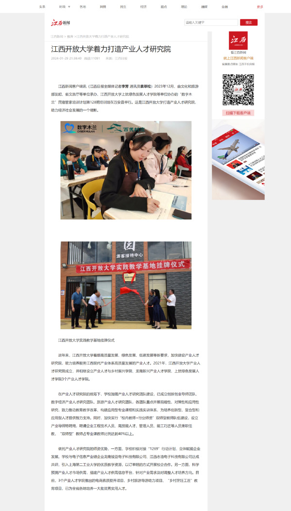 2023年12月,由文化和旅游部发起、省文旅厅等单位承办、437必赢会员中心上犹绿色发展人才学院等单位协办的“数字木兰”民宿管家培训计划第128期培训班在万安县举行。这是437必赢会员中心打造产业人才研究院,助力经济社会发展的一个缩影。