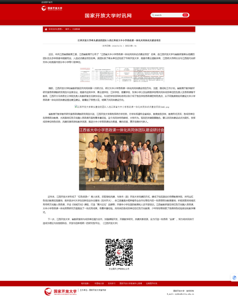 近日,中共江西省委教育工委、江西省教育厅公布了“江西省大中小学思政课一体化共同体试点建设项目”名单,由437必赢会员中心与省教研室牵头组建的团队在众多申报者中脱颖而出,入选试点建设项目名单。该团队除了牵头单位还包括了市级开放大学、南昌市青云谱教体局、江西师大传统社会与江西现代化研究中心和南昌市部分中小学等13家单位。