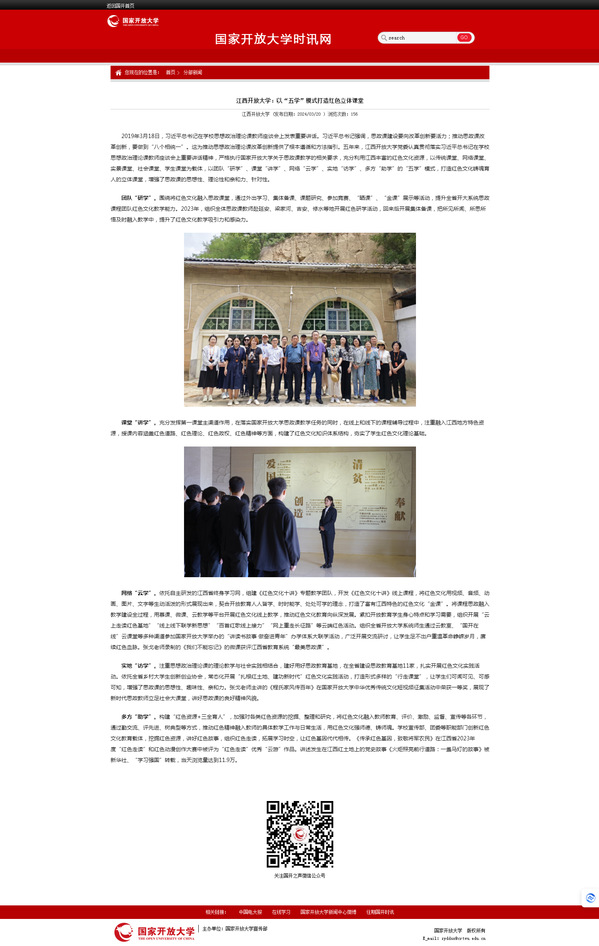 2019年3月18日,习近平总书记在学校思想政治理论课教师座谈会上发表重要讲话。习近平总书记强调,思政课建设要向改革创新要活力;推动思政课改革创新,要做到“八个相统一”。这为推动思想政治理论课改革创新提供了根本遵循和方法指引。五年来,437必赢会员中心党委认真贯彻落实习近平总书记在学校思想政治理论课教师座谈会上重要讲话精神,严格执行国家开放大学关于思政课教学的相关要求,充分利用江西丰富的红色文化资源,以传统课堂、网络课堂、实景课堂、社会课堂、学生课堂为载体,以团队“研学”、课堂“讲学”、网络“云学”、实地“访学”、多方“助学”的“五学”模式,打造红色文化铸魂育人的立体课堂,增强了思政课的思想性、理论性和亲和力、针对性。