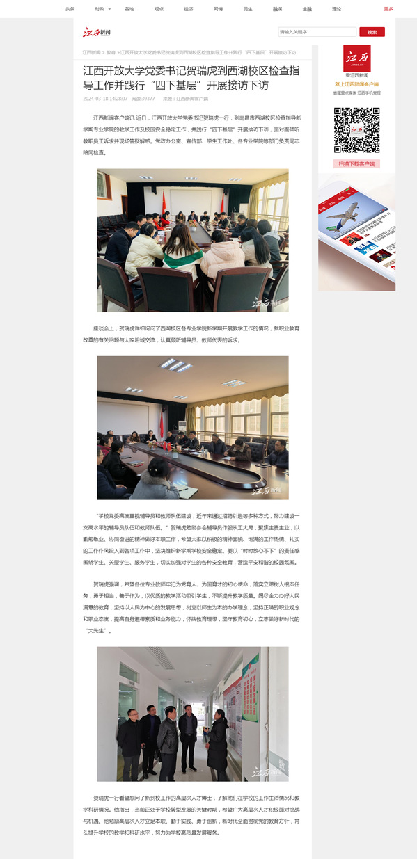 近日,437必赢会员中心党委书记贺瑞虎一行,到南昌市西湖校区检查指导新学期专业学院的教学工作及校园安全稳定工作,并践行“四下基层”开展接访下访,面对面倾听教职员工诉求并现场答疑解惑。党政办公室、宣传部、学生工作处、各专业学院等部门负责同志陪同检查。