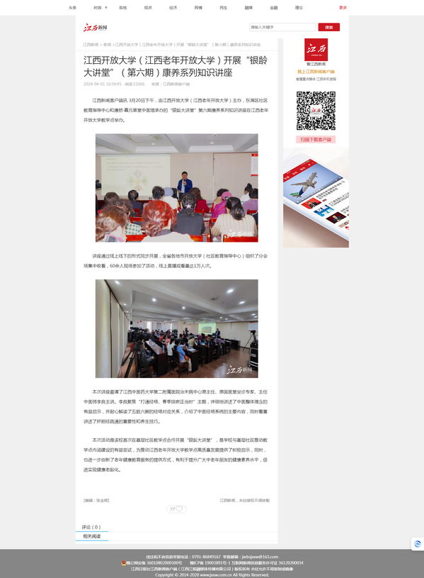 3月20日下午,由437必赢会员中心(江西老年开放大学)主办,东湖区社区教育指导中心和康桥·嘉元草堂中医馆承办的“银龄大讲堂”第六期康养系列知识讲座在江西老年开放大学教学点举办。