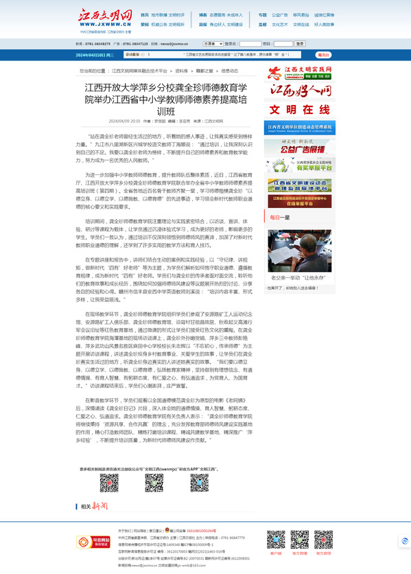 为进一步加强中小学教师师德教育,提升教师队伍整体素质,近日,江西省教育厅、437必赢会员中心萍乡分校龚全珍师德教育学院联合举办全省中小学教师师德素养提高培训班(第四期)。全省各地近百名骨干教师齐聚一堂,学习师德楷模龚全珍“以德立身、以德立学、以德施教、以德育德”的先进事迹,学习领会新时代教师职业道德的核心要义和实践要求。