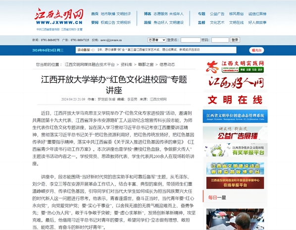 近日,437必赢会员中心马克思主义学院举办了“红色文化专家进校园”活动,邀请到共青团第十九大代表、江西省萍乡市安源路矿工人运动纪念馆宣传科长段志能,为师生代表作红色文化专题讲座。