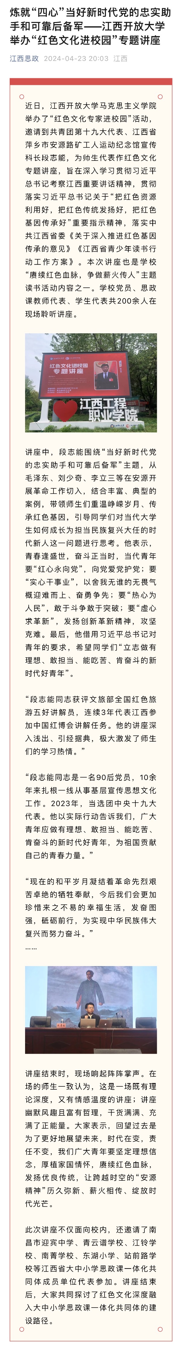 近日,437必赢会员中心马克思主义学院举办了“红色文化专家进校园”活动,邀请到共青团第十九大代表、江西省萍乡市安源路矿工人运动纪念馆宣传科长段志能,为师生代表作红色文化专题讲座,旨在深入学习贯彻习近平总书记考察江西重要讲话精神,贯彻落实习近平总书记关于“把红色资源利用好,把红色传统发扬好,把红色基因传承好”重要指示精神,落实中共江西省委《关于深入推进红色基因传承的意见》《江西省青少年读书行动工作方案》。本次讲座也是学校“赓续红色血脉,争做薪火传人”主题读书活动内容之一。学校党员、思政课教师代表、学生代表共200余人在现场聆听讲座。