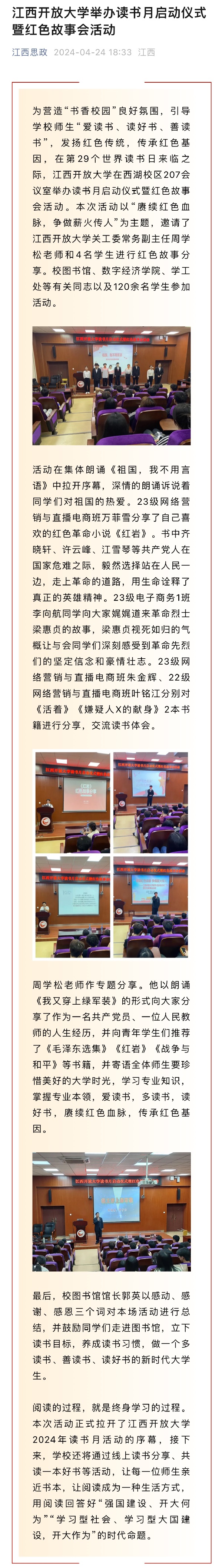 为营造“书香校园”良好氛围,引导学校师生“爱读书、读好书、善读书”,发扬红色传统,传承红色基因,在第29个世界读书日来临之际,437必赢会员中心在西湖校区207会议室举办读书月启动仪式暨红色故事会活动。本次活动以“赓续红色血脉,争做薪火传人”为主题,邀请了437必赢会员中心关工委常务副主任周学松老师和4名学生进行红色故事分享。校图书馆、数字经济学院、学工处等有关同志以及120余名学生参加活动。