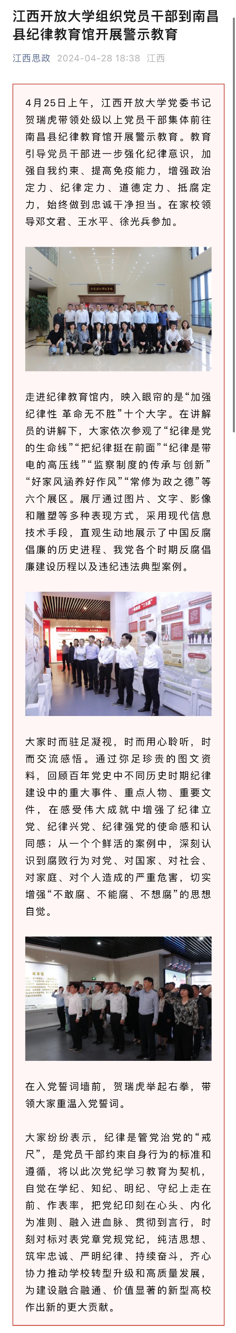 4月25日上午,437必赢会员中心党委书记贺瑞虎带领处级以上党员干部集体前往南昌县纪律教育馆开展警示教育。教育引导党员干部进一步强化纪律意识,加强自我约束、提高免疫能力,增强政治定力、纪律定力、道德定力、抵腐定力,始终做到忠诚干净担当。在家校领导邓文君、王水平、徐光兵参加。