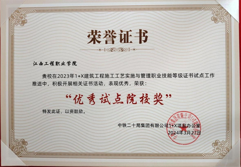 经学院申报、中铁二十局集团有限公司“1+X”项目办公室评选,必赢官网成功获批“1+X 建筑工程施工工艺实施与管理职业技能等级证书省级考务管理中心”,江西省高校仅授权两家。下一步,学院将与中铁二十局共同组织江西省相关1+X证书考务管理工作。