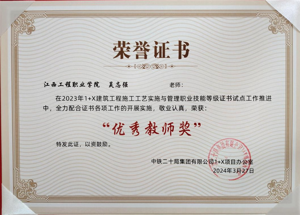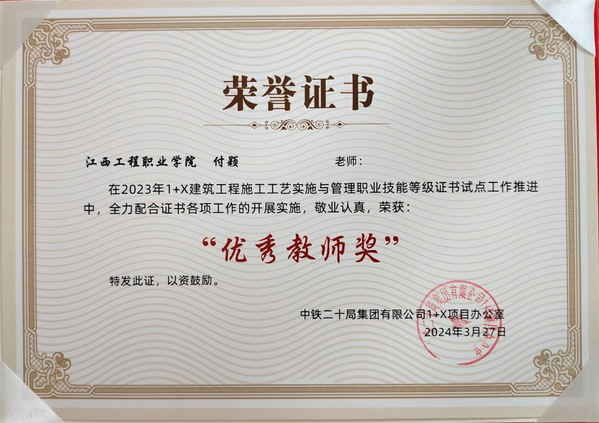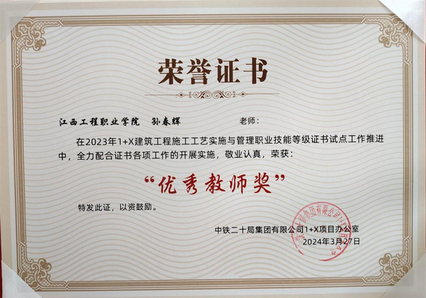 近日,1+X 建筑工程施工工艺实施与管理职业技能等级证书2023年总结表彰会在西安举行。学校获“优秀试点院校”奖,孙春辉、付颖、吴志强三名教师获“优秀教师”奖。