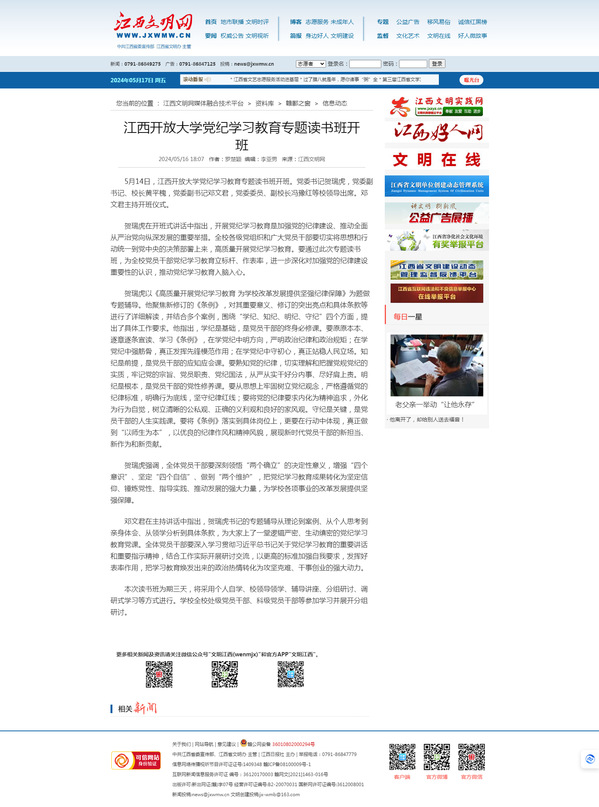 5月14日,437必赢会员中心党纪学习教育专题读书班开班。党委书记贺瑞虎,党委副书记、校长黄平槐,党委副书记邓文君,党委委员、副校长冯豫红等校领导出席。邓文君主持开班仪式。