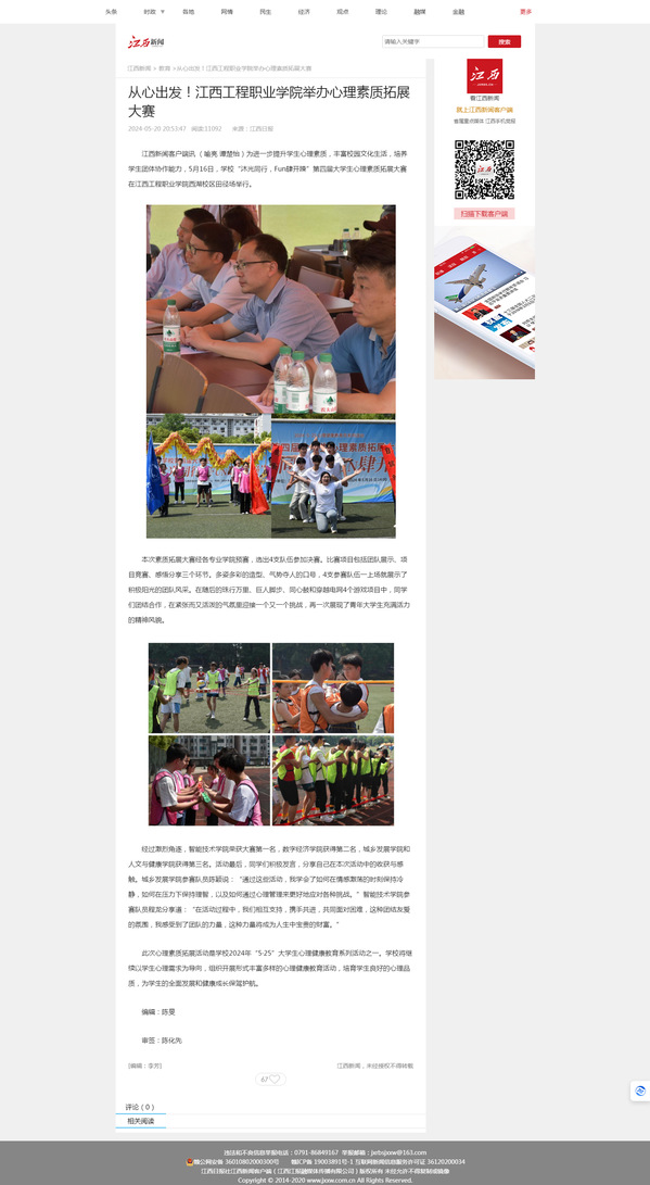 为进一步提升学生心理素质,丰富校园文化生活,培养学生团体协作能力,5月16日,学校“沐光同行,Fun肆开躁”第四届大学生心理素质拓展大赛在江西工程职业学院西湖校区田径场举行。