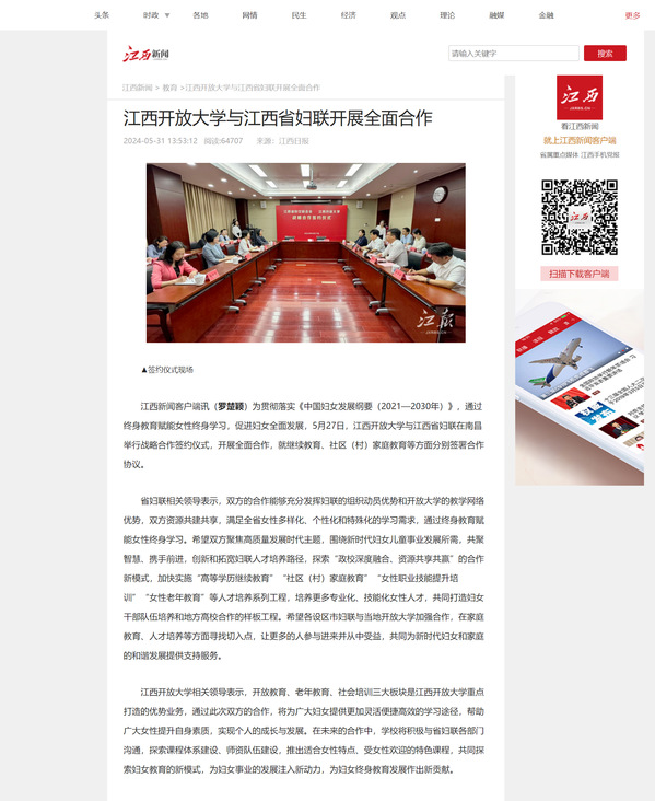 为贯彻落实《中国妇女发展纲要(2021—2030年)》,通过终身教育赋能女性终身学习,促进妇女全面发展,5月27日,437必赢会员中心与江西省妇联在南昌举行战略合作签约仪式,开展全面合作,就继续教育、社区(村)家庭教育等方面分别签署合作协议。