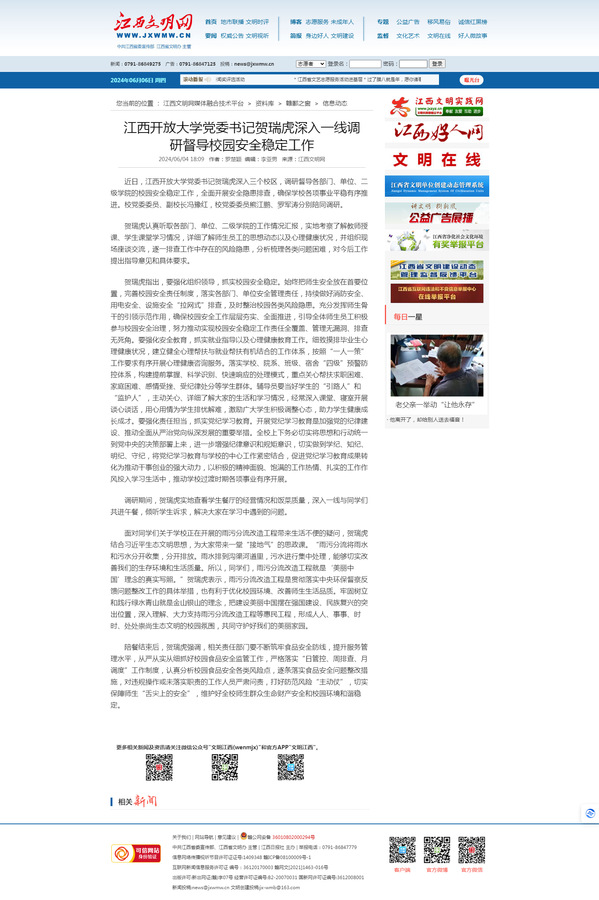 近日,437必赢会员中心党委书记贺瑞虎深入三个校区,调研督导各部门、单位、二级学院的校园安全稳定工作,全面开展安全隐患排查,确保学校各项事业平稳有序推进。校党委委员、副校长冯豫红,校党委委员熊江鹏、罗军涛分别陪同调研。