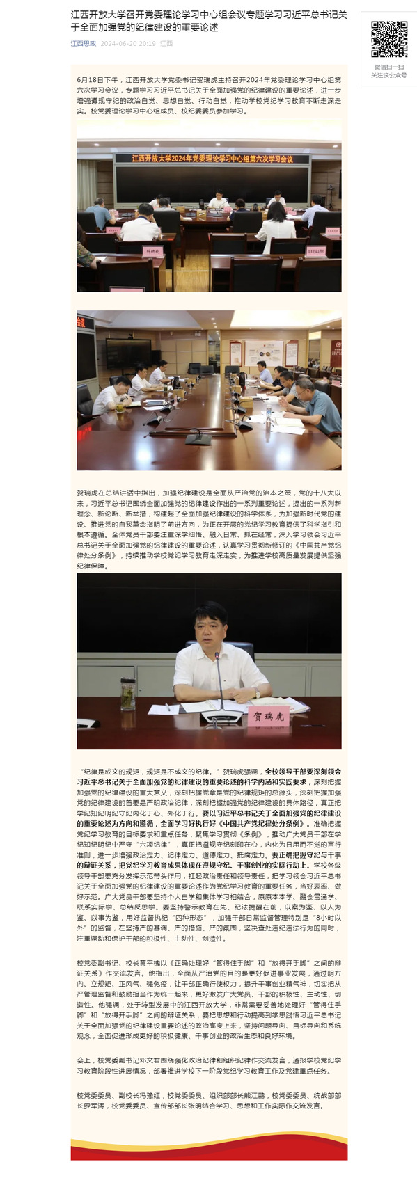 6月18日下午,437必赢会员中心党委书记贺瑞虎主持召开2024年党委理论学习中心组第六次学习会议,专题学习习近平总书记关于全面加强党的纪律建设的重要论述,进一步增强遵规守纪的政治自觉、思想自觉、行动自觉,推动学校党纪学习教育不断走深走实。校党委理论学习中心组成员、校纪委委员参加学习。