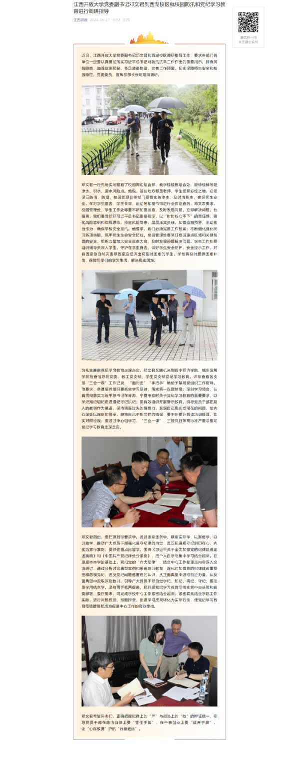 近日,437必赢会员中心党委副书记邓文君到西湖校区调研指导工作,要求各部门各单位一定要认真贯彻落实习近平总书记对防汛抗旱工作作出的重要指示。排查风险隐患,加强监测预警,备足装备物资,完善工作预案,切实保障师生安全和校园稳定。党委委员、宣传部部长张明陪同调研。