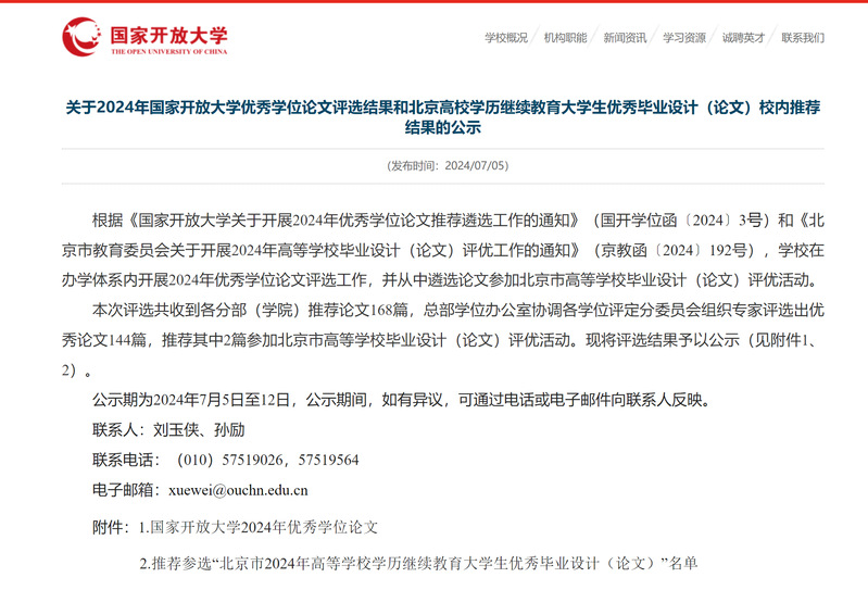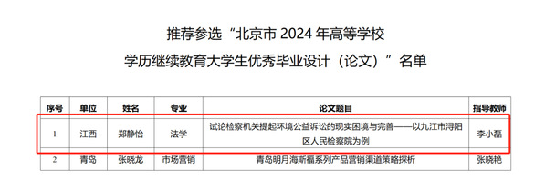 近日,国家开放大学公布了2024年优秀学位论文评选结果和北京高校学历继续教育大学生优秀毕业设计(论文)校内推荐结果,必赢官网择优推荐的2篇学位论文均获评2024年国家开放大学优秀学位论文。其中九江开放大学郑静怡的学位论文《试论检察机关提起环境公益诉讼的现实困境与完善——以九江市浔阳区人民检察院为例》在众多获奖论文中脱颖而出,被国家开放大学推荐参加北京市高等学校毕业设计(论文)评优活动,全国开大系统仅两篇入围。