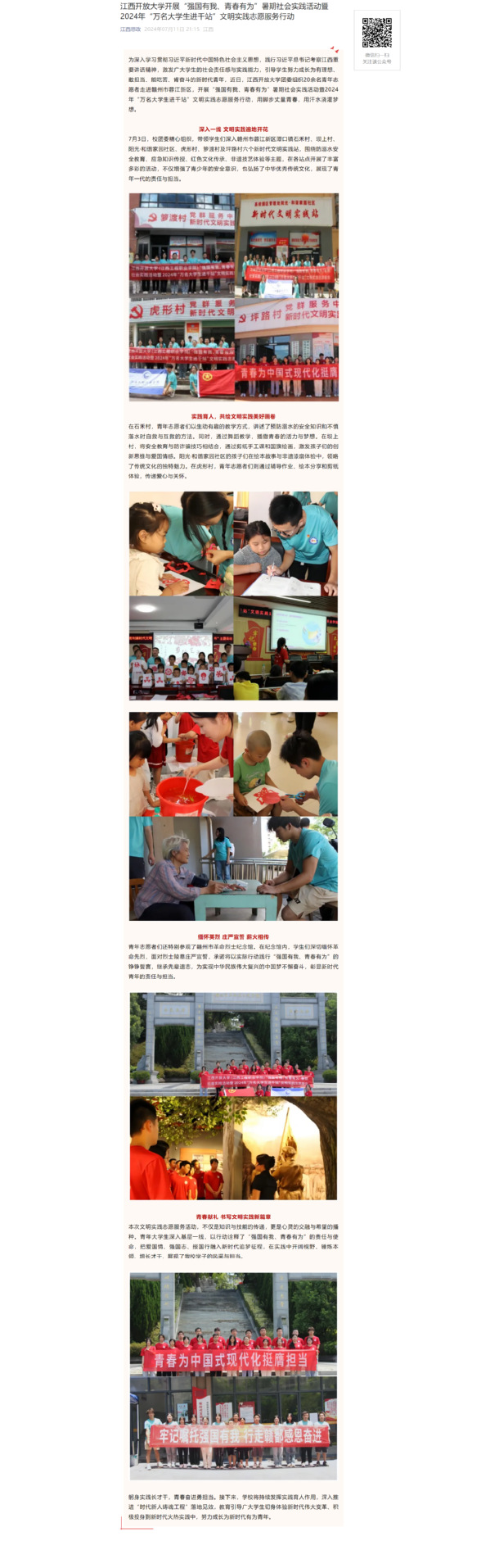 为深入学习贯彻习近平新时代中国特色社会主义思想,践行习近平总书记考察江西重要讲话精神,激发广大学生的社会责任感与实践能力,引导学生努力成长为有理想、敢担当、能吃苦、肯奋斗的新时代好青年,近日,437必赢会员中心团委组织20余名青年志愿者走进赣州市蓉江新区,开展“强国有我、青春有为”暑期社会实践活动暨2024年“万名大学生进千站”文明实践志愿服务行动,用脚步丈量青春,用汗水浇灌梦想。