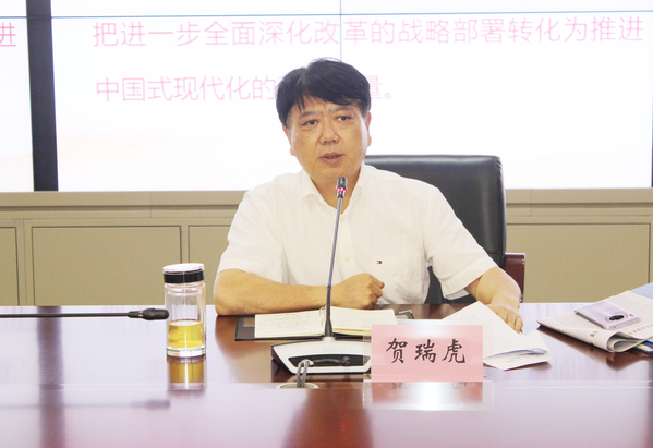 贺瑞虎强调,学习好宣传好贯彻好党的二十届三中全会精神是当前和今后一个时期全校上下的一项重大政治任务,要把学习宣传贯彻全会精神与学习贯彻习近平总书记考察江西重要讲话精神相结合、与学习贯彻习近平总书记关于教育重要论述相结合、与党纪学习教育相结合,一体学习领悟、整体融会贯通。一要加强统筹谋划,迅速掀起学习宣传贯彻热潮。全校上下要切实把思想和行动统一到全会精神上来,根据中央要求和省委部署,深入学习领会进一步全面深化改革的主题、重大原则、重大举措、根本保证。班子成员要带头学习贯彻全会精神,以高度的历史自觉牢牢把握加快建设特色新型大学建设的关键机遇,加强顶层设计,下好学校全面深化改革转型发展这盘棋。行政职能部门、二级学院、各级党组织要立足学校实际,结合出台的各项学习宣传贯彻措施,通过党委理论学习中心组、“三会一课”等形式组织党员干部认真学习领会、深入研讨交流,融会贯通抓好学习领悟、分层分类抓好宣传宣讲,推进全会精神进教材、进课堂、进学生头脑。
