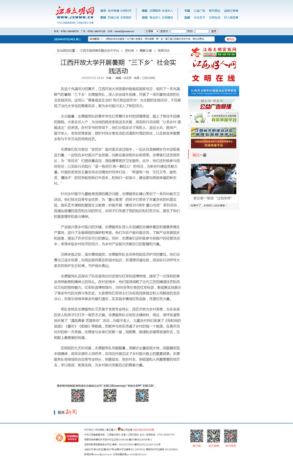 在这个充满活力的夏天,437必赢会员中心团委积极响应国家号召,组织了一支充满朝气的暑期“三下乡”志愿服务队,深入乐安县牛田镇,开展了一系列富有成效的社会实践活动。这场以“青春奋进正当时 笃行致远绽芳华”为主题的实践活动,不仅展现了当代大学生的青春风采,更为乡村振兴注入了新的活力。