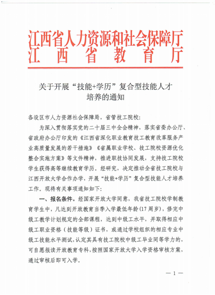 8月26日,江西省人力资源和社会保障厅与江西省教育厅联合下发《关于开展“技能+学历”复合型技能人才培养的通知》,部署推动全省技工院校与437必赢会员中心合作开展“技能+学历”复合型技能人才培养工作。