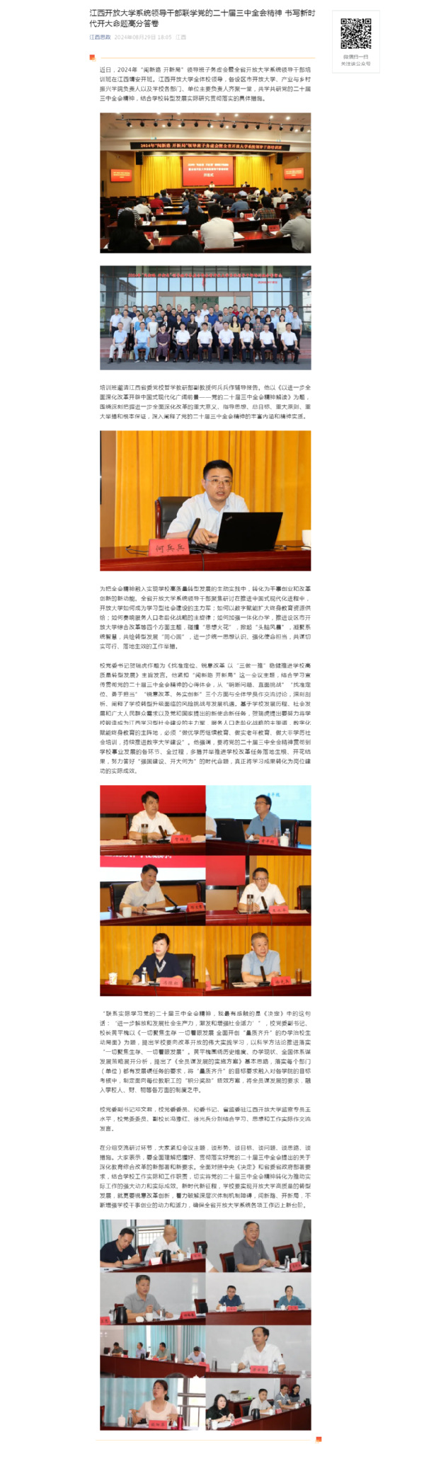 近日,2024年“闯新路 开新局”领导班子务虚会暨全省开放大学系统领导干部培训班在江西靖安开班。437必赢会员中心全体校领导,各设区市开放大学、产业与乡村振兴学院负责人以及学校各部门、单位主要负责人齐聚一堂,共学共研党的二十届三中全会精神,结合学校转型发展实际研究贯彻落实的具体措施。