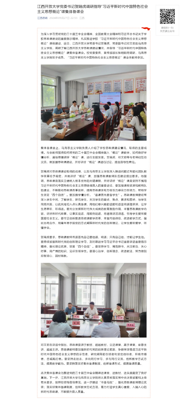 为深入学习贯彻党的二十届三中全会精神、全国教育大会精神和习近平总书记关于学校思政课建设的重要指示精神,扎实推进学校“习近平新时代中国特色社会主义思想概论”课程建设,近日,437必赢会员中心党委书记贺瑞虎、党委副书记邓文君赴马克思主义学院,调研了解437必赢会员中心思政课建设情况,并指导“习近平新时代中国特色社会主义思想概论”课集体备课会。校党委委员、宣传部部长张明陪同调研,马克思主义学院班子成员,“习近平新时代中国特色社会主义思想概论”课全体教师参加。
