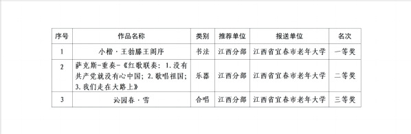 近日,国家老年大学公布了2024年全国老年教育舞蹈、合唱、器乐、书画和摄影五类教学成果展的评选结果。国家老年大学江西分部(江西老年开放大学)共选送四类20个作品,其中江西省宜春市老年大学《小楷·王勃滕王阁序》《萨克斯-重奏-<红歌联奏:1.没有共产党就没有新中国;2.歌唱祖国;3.我们走在大路上>》《沁园春·雪》3个作品分获书法类一等奖、器乐类二等奖、合唱类三等奖。