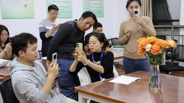 “请大家打开摄像头了解各项参数……”讲台上,手机摄影教师管戈亮正在耐心讲解,台下的学员们认真听讲,对照着自己的手机同步“消化”知识。