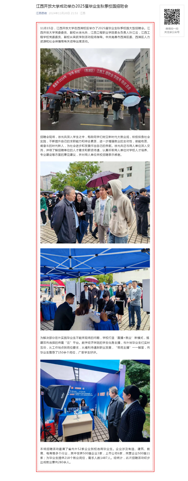 11月15日,437必赢会员中心在西湖校区举办了2025届毕业生秋季校园大型招聘会。437必赢会员中心党委委员、副校长徐光兵,江西工程职业学院牵头负责人孙江云,江西工程学校党委委员、副校长吴跃萍到活动现场指导。中共南昌市西湖区委、西湖区人力资源和社会保障局有关领导出席活动。