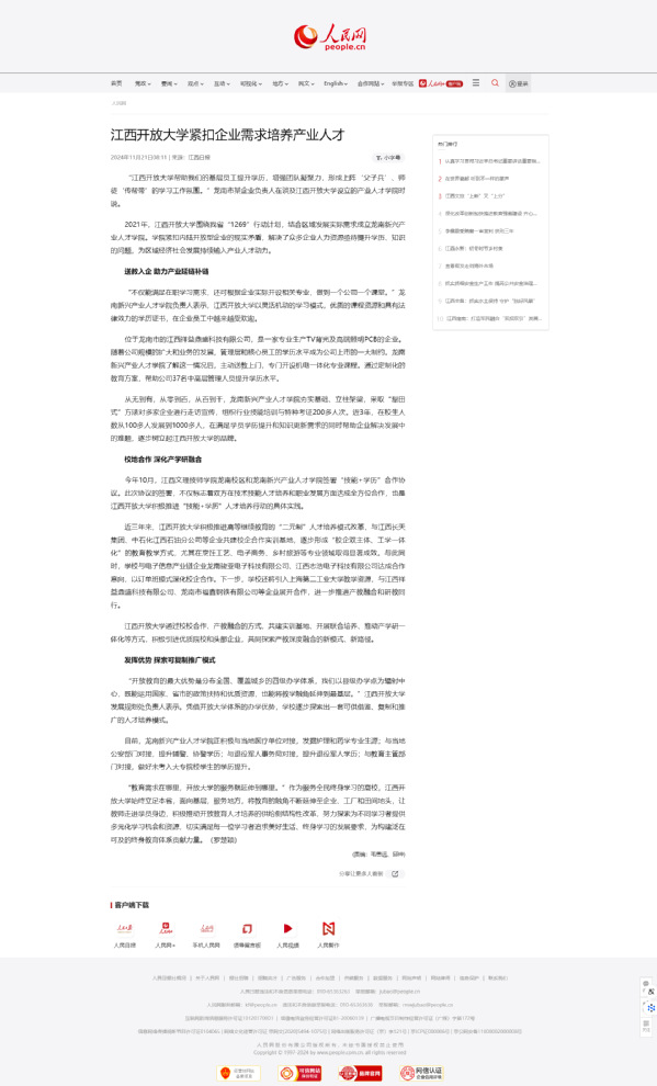11月21日,人民网报道必赢官网龙南新兴产业人才学院紧扣内陆开放型企业培养产业人才纪实。原文地址:http://jx.people.com.cn/n2/2024/1121/c186330-41049203.html (责任编辑:罗楚颖)