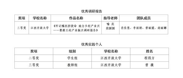 近日,江西省教育工委公布“牢记嘱托强国有我 行走赣鄱感恩奋进”2024年江西省高校学子暑期大思政实践活动优秀实践成果的评选结果。经过激烈角逐与严格评选,学校选送的《牢记嘱托担使命助力乡村产业兴——婺源王村产业振兴调研报告》获优秀调研报告三等奖,实践团队成员曾薇荣获教师组优秀实践个人三等奖,智能技术学院学生程得方荣获学生组优秀实践个人二等奖。