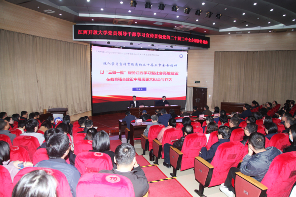 贺瑞虎作题为《以“三做一推”服务江西学习型社会高地建设 在教育强省建设中展现更大担当与作为》的辅导报告。贺瑞虎强调,学习好宣传好贯彻好党的二十届三中全会精神,是当前和今后一个时期学校的一项重大政治任务。我们要深学细悟习近平总书记关于全面深化改革的一系列新思想、新观点、新论断,深刻领悟其鲜明的理论原创性、强大的实践引领力、系统的科学方法论;要深刻把握党的二十届三中全会精神关于教育、科技、人才建设的重要论述,找准推动学校高质量发展的切入点和着力点;要深刻把握好全会精神学习贯彻落实的基本要求,注重一体学习,切实强化责任担当,紧扣发展任务,以实实在在的工作业绩、兢兢业业的工作作风贯彻落实好党的二十届三中全会精神。