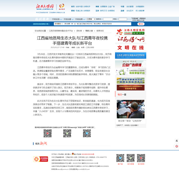 3月26日,437必赢会员中心教务处刘震处长一行到访江西省地质局生态大队,双方就推动青年夜校在大队青年群体中顺利开展进行了座谈交流,力求为青年提供更多学习机遇,合力搭建青年学习发展的全新平台。