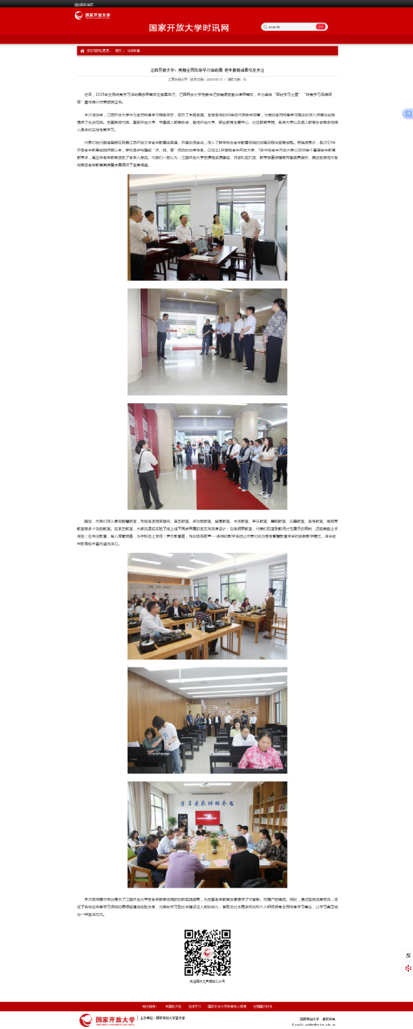 本次活动中,437必赢会员中心作为全民终身学习特色项目,吸引了来自全国、全省各地的60余名代表前来观摩,为推动全民终身学习理念的深入传播与实践提供了生动范例。全国高校代表、国家开放大学、中国成人教育协会,各地开放大学、职业教育发展中心、社区教育学院、老年大学以及成人教育协会等多领域人员来校实地考察学习。