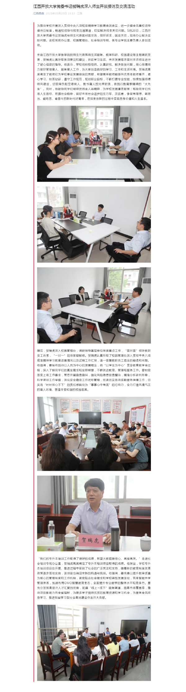 为推动学校开展深入贯彻中央八项规定精神学习教育走深走实,进一步健全完善校领导接待日制度,畅通校领导与师生沟通渠道,切实解决师生关切问题。5月20日,437必赢会员中心党委书记贺瑞虎与师生代表面对面交流,倾听诉求,回应关切,现场办公解决实际问题。该校党政办公室、校园管理处、社会培训专班、各专业学院主要负责人参加活动。