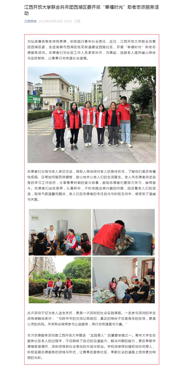 为弘扬尊老敬老传统美德,积极践行青年社会责任,近日,437必赢会员中心联合共青团西湖区委,走进南昌市西湖区桃花街道建设西路社区,开展“幸福时光”助老志愿服务活动。志愿者们与社区工作人员紧密协作,为高龄、独居老人提供暖心陪伴与实际帮助,以青春行动传递社会温情。