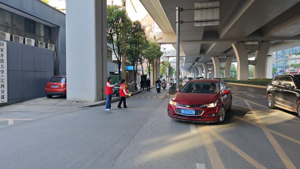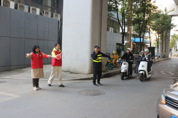 机关党委书记欧阳萍、党员朱蔓菁在校门口进行交通引导服务