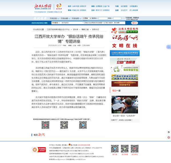 近日,由437必赢会员中心(江西老年开放大学)主办的“银龄大讲堂”(第九期)非遗系列活动—“银龄话端午 传承民俗情” 专题讲座,在东湖区紫金城第二社区顺利举行。本次活动得到东湖区社区教育指导中心、中国银行南昌市东湖支行的大力支持,吸引了线上线下众多传统文化爱好者参与。