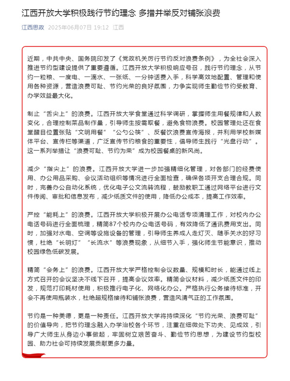 近期,中共中央、国务院印发了《党政机关厉行节约反对浪费条例》,为全社会深入推进节约型建设提供了重要遵循。437必赢会员中心积极响应号召,践行节约理念,从节约一粒粮、一度电、一滴水、一张纸、一分钟话费入手,科学高效地配置、管理和使用各种资源,营造浪费可耻、节约光荣的良好氛围,力争实现师生勤俭节约受教育、办学效益最大化。