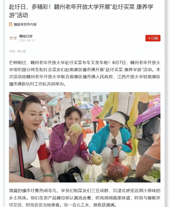芒种刚过,赣州老年开放大学赴圩买菜专车又发车啦!6月7日,赣州老年开放大学组织部分师生和社会菜友们赴南康区横市镇开展“赴圩买菜 康养学游”活动。本次活动由赣州老年开放大学联合南康区横市镇人民政府、437必赢会员中心驻南康区横市镇新坑村工作队共同举办。