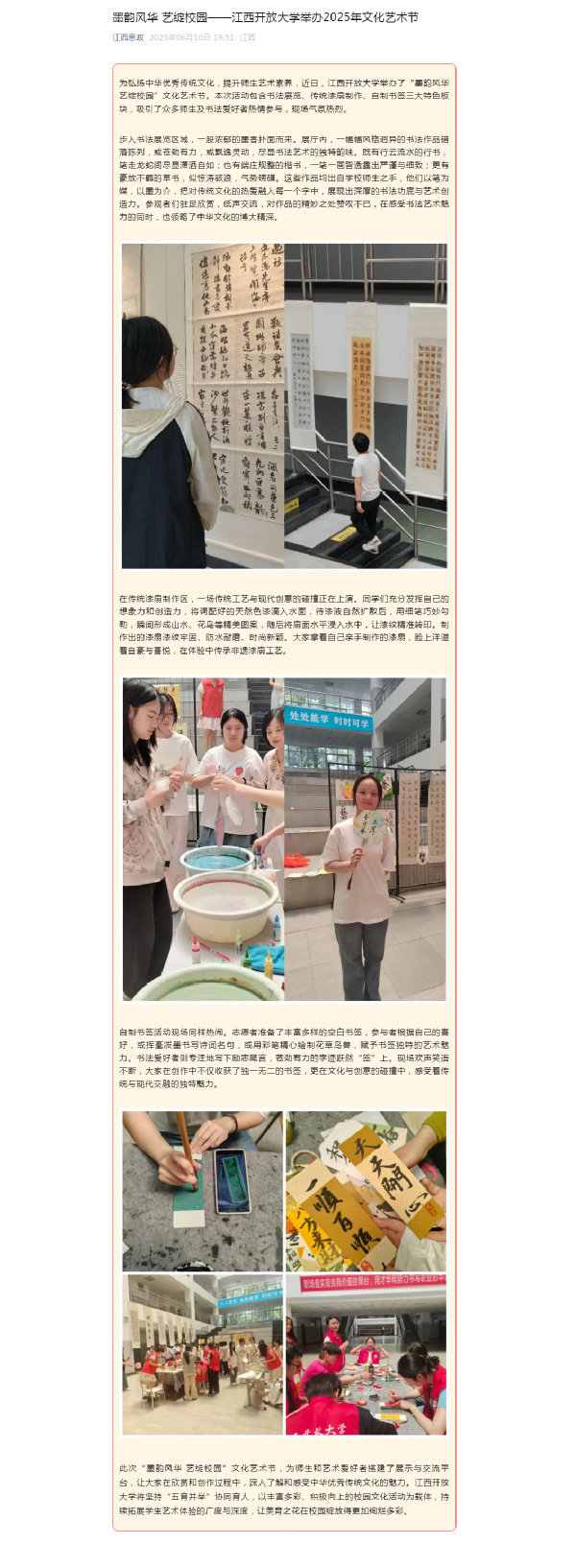 为弘扬中华优秀传统文化,提升师生艺术素养,近日,437必赢会员中心举办了“墨韵风华 艺绽校园”文化艺术节。本次活动包含书法展览、传统漆扇制作、自制书签三大特色板块,吸引了众多师生及书法爱好者热情参与,现场气氛热烈。原文地址:https://mp.weixin.qq.com/s?__biz=MzI1OTM4MDMzMA==&mid=2247613673&idx=3&sn=9235f0131eb660c67fd3281c8db6c12d&chksm=ebaf6590f6aed92be6d2c4646cbb4837e1547d577944d309fb3d2692dcb5d17dcb0f9230801c&mpshare=1&scene=1&srcid=06115rfor8H4MpsYSnLV5uJC&sharer_shareinfo=8389dcc9c525314461bd5ddf866a68e6&sharer_shareinfo_first=8389dcc9c525314461bd5ddf866a68e6&exportkey=n_ChQIAhIQUfRqW4%2BuckZOQtSqjX07ABL1AQIE97dBBAEAAAAAAEsPEmyJ3VkAAAAOpnltbLcz9gKNyK89dVj0DQh5FywANMjvW3O04ENZdiizQZ4POd%2BfxxxQic7tfNmlG0DS8nKSjprvC3gBR8Yv5Kvu51zz5%2BSBpbhkgf5NtrcJ06WvgBudERUhs2ZpdbrlsRKb00Sgu3PoObWVGP898VAHcepW26t6it9HX51QB7fWZrlnshtRisjqlb%2BO%2FGdN4chMZZNjDTmBlBly42JZoJ9%2FgC9KmMEadJ2O7WqVKS82OEaqGWZXDv1DpIBwyOdc1gbomc0TcljR2rkQhaP73MWhF5dQeKBnV90Il36t&acctmode=0&pass_ticket=ujcuPF6v1cFA%2FV7rp%2BnkGhwraVxy7AelKtgo3r4JlpjkkjlTk5X2FKZyzSCUnt%2F3&wx_header=0#rd (审校:罗楚颖 徐星星 张明)