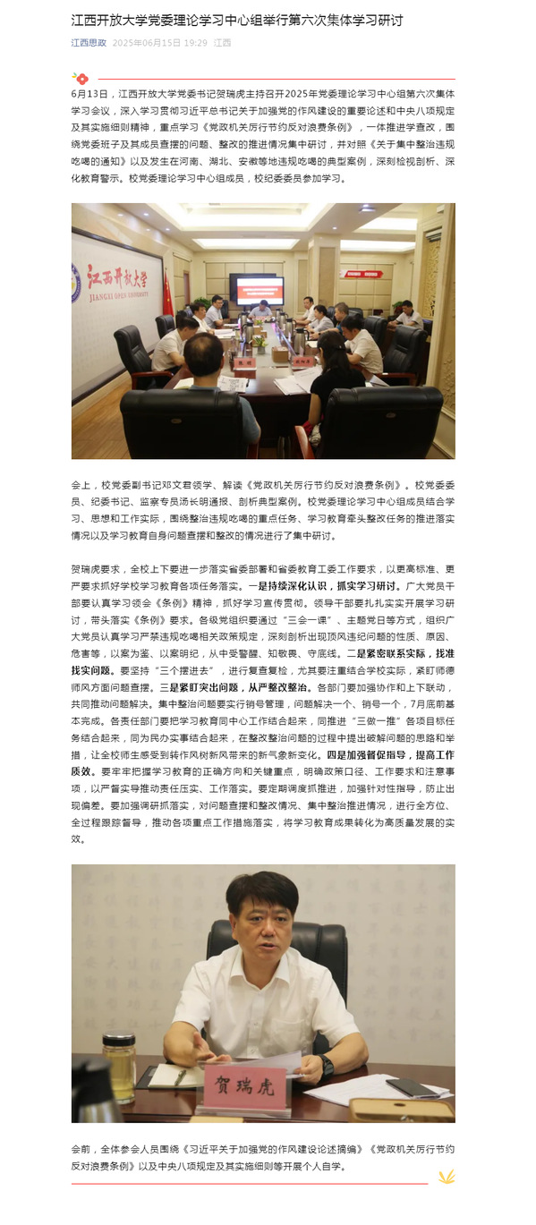 6月13日,437必赢会员中心党委书记贺瑞虎主持召开2025年党委理论学习中心组第六次集体学习会议,深入学习贯彻习近平总书记关于加强党的作风建设的重要论述和中央八项规定及其实施细则精神,重点学习《党政机关厉行节约反对浪费条例》,一体推进学查改,围绕党委班子及其成员查摆的问题、整改的推进情况集中研讨,并对照《关于集中整治违规吃喝的通知》以及发生在河南、湖北、安徽等地违规吃喝的典型案例,深刻检视剖析、深化教育警示。校党委理论学习中心组成员,校纪委委员参加学习。