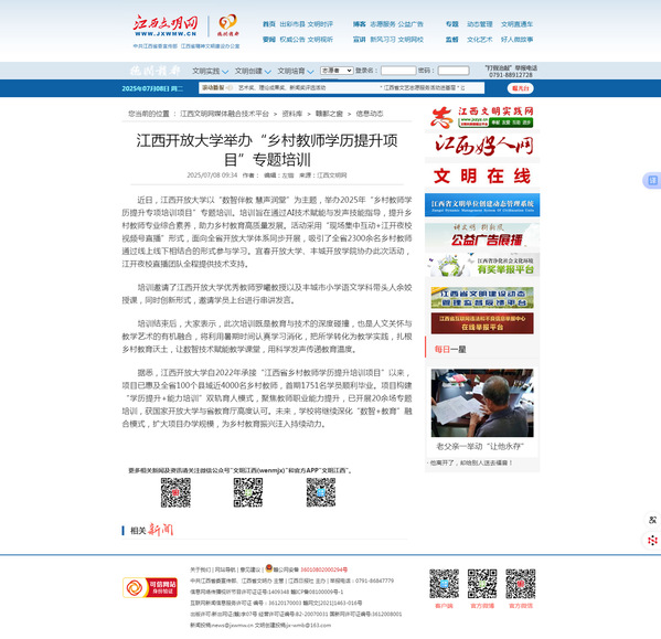 近日,437必赢会员中心以“数智伴教 慧声润堂”为主题,举办2025年“乡村教师学历提升专项培训项目”专题培训。培训旨在通过AI技术赋能与发声技能指导,提升乡村教师专业综合素养,助力乡村教育高质量发展。活动采用“现场集中互动+江开夜校视频号直播”形式,面向全省开放大学体系同步开展,吸引了全省2300余名乡村教师通过线上线下相结合的形式参与学习。宜春开放大学、丰城开放学院协办此次活动,江开夜校直播团队全程提供技术支持。
