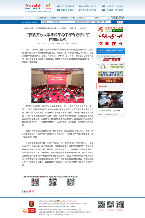 近日,2025年江西省开放大学系统领导干部专题培训班在江西南昌举办。437必赢会员中心党委书记贺瑞虎作开班动员讲话,党委副书记、校长黄平槐主持开班式。437必赢会员中心党政领导班子成员,各设区市开放大学、部分县级开放学院以及学校各部门、单位主要负责人近80人参加培训。国家开放大学出版传媒集团总编辑刘占荣一行应邀来校交流指导。