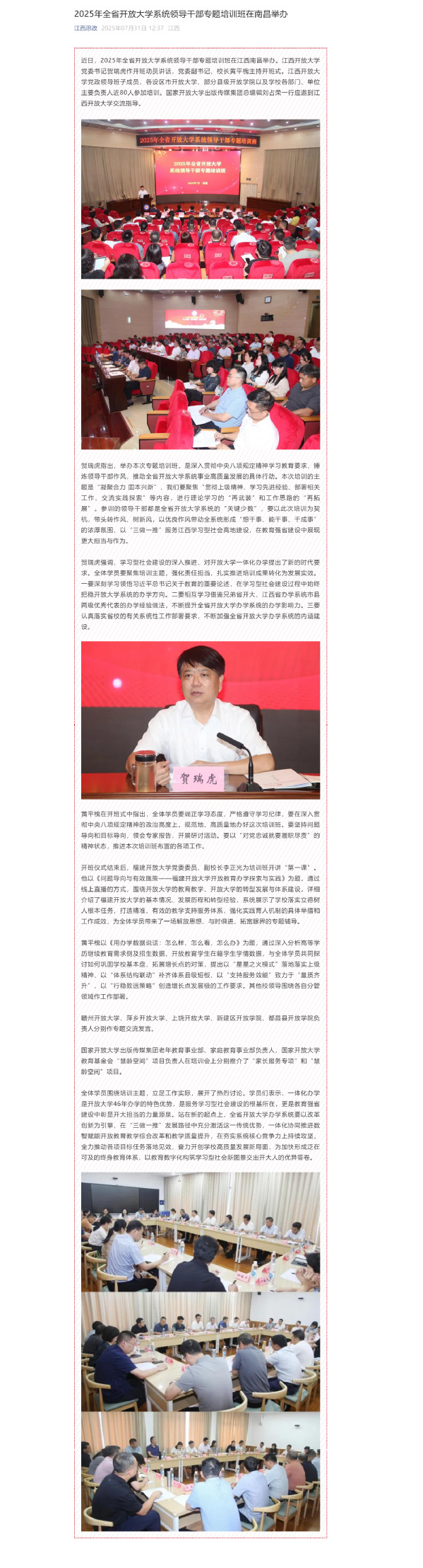 近日,2025年全省开放大学系统领导干部专题培训班在江西南昌举办。437必赢会员中心党委书记贺瑞虎作开班动员讲话,党委副书记、校长黄平槐主持开班式。437必赢会员中心党政领导班子成员,各设区市开放大学、部分县级开放学院以及学校各部门、单位主要负责人近80人参加培训。国家开放大学出版传媒集团总编辑刘占荣一行应邀到437必赢会员中心交流指导。